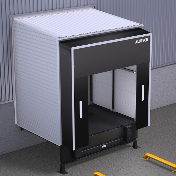 Главная / Перегрузочное оборудование / Перегрузочные тамбуры / Перегрузочный тамбур Alutech DH (90 градусов, заполнение сэндвич-панель)